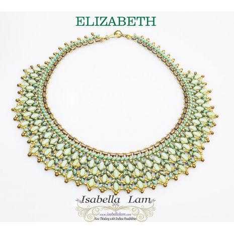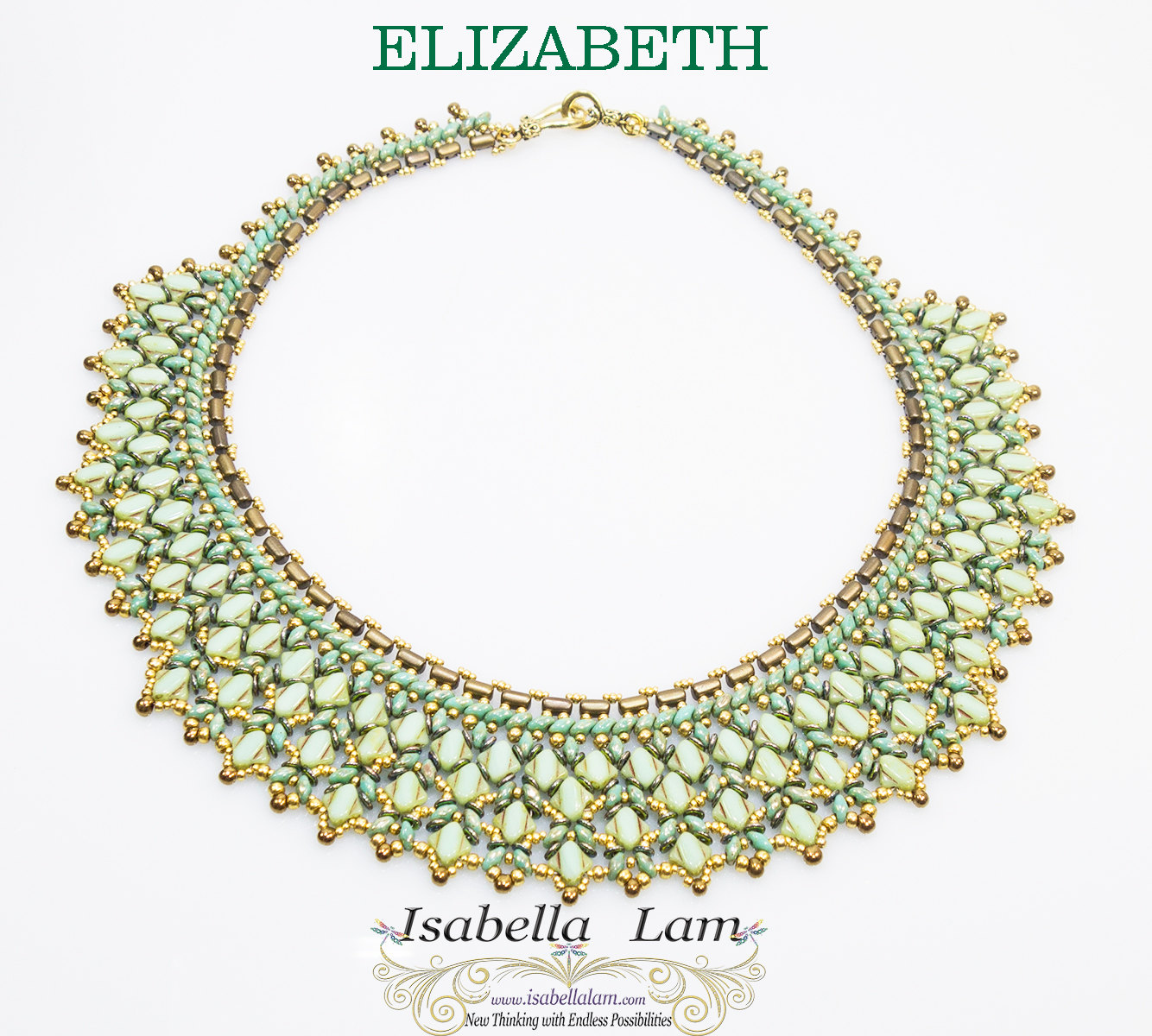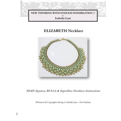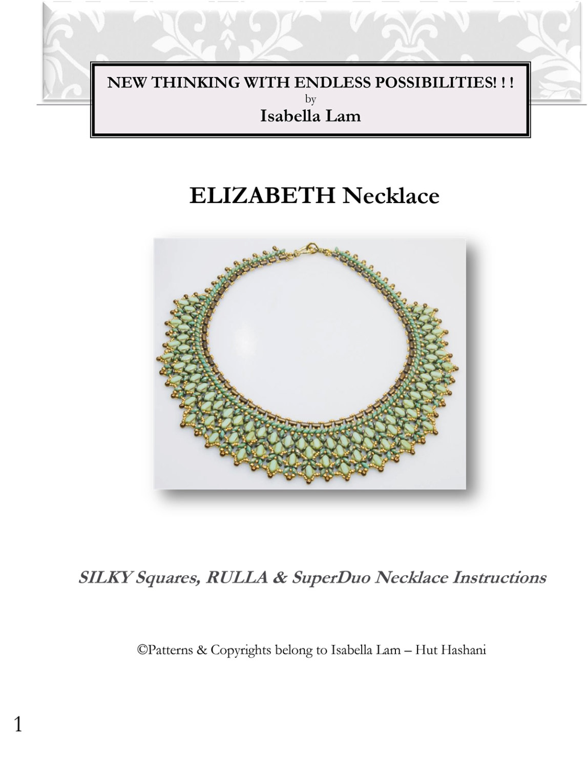 ELIZABETH Silky SuperDuo Rulla and OBeads Beadwork Necklace PDF Pattern Tutorial instructions is a great way to learn how to weave with amazing new Silky squares, Czech RULLA beads,O-Beads, SuperDuo two hole beads, Miyuki drop and round glass seed beads in a creative way to make this elegant style necklace.